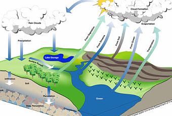 El agua en la Tierra siempre está en movimiento y cambia constantemente de estado (líquido, gaseoso y sólido), lo que está directamente relacionado con la energía proporcionada por el sol. El sol calienta el agua de los océanos y ésta se evapora, de forma que las corrientes ascendentes llevan el vapor a las capas superiores de la atmósfera, donde se forman las nubes. Las corrientes de aire mueven esas nubes sobre la superficie de la Tierra y cuando se producen unas condiciones de presión y temperatura determinadas, el agua se condensa y por efecto de la gravedad precipita en forma de lluvia, granizo o nieve.
