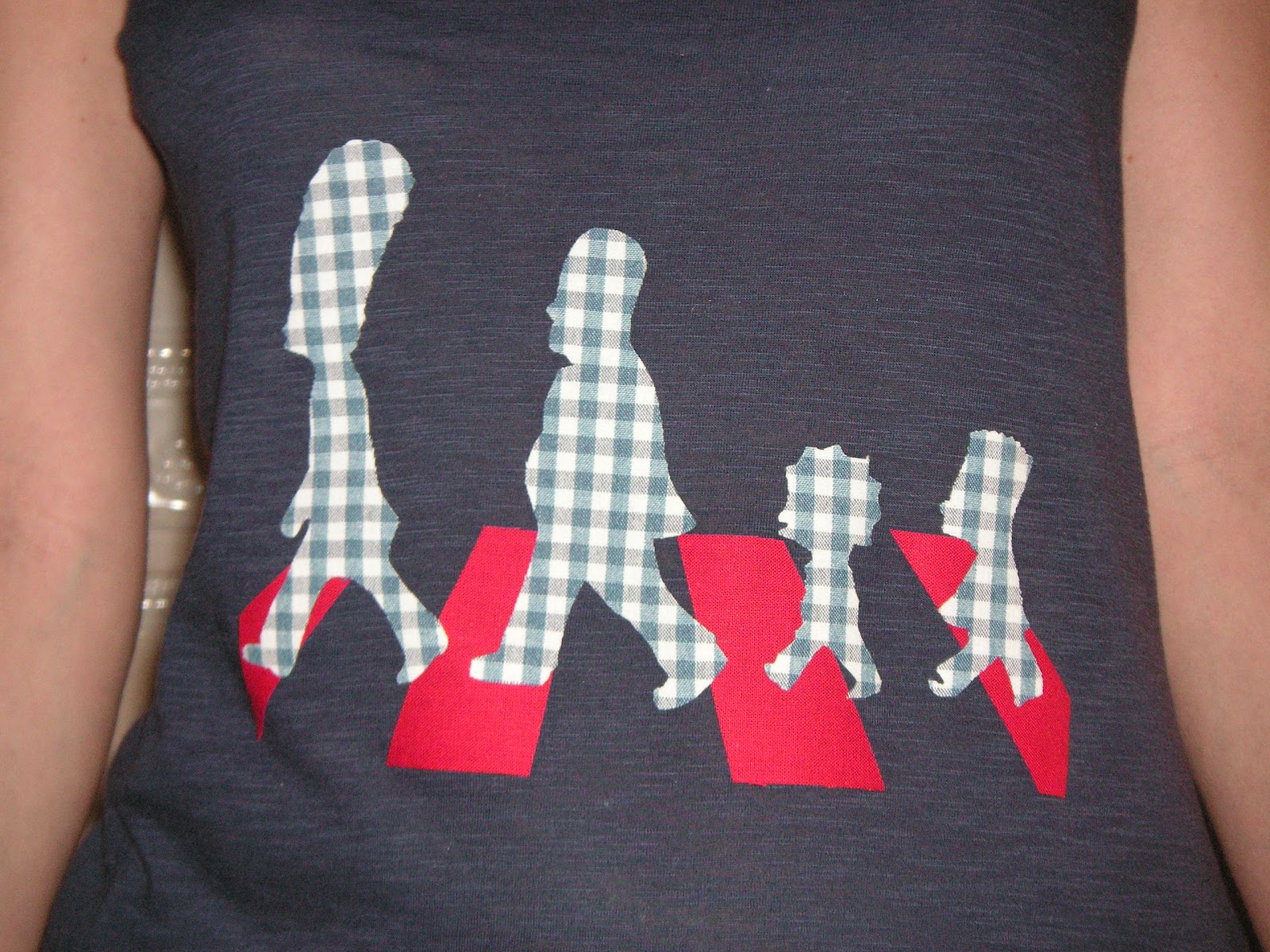 En este punto me entra la ansiedad por verlo terminado y me olvido de la cámara, de las fotos y del blog. Pero lo explico: el siguiente paso es empezar por el paso de peatones que ya está recortado en tela roja. El lado que hemos planchado es el lado donde está el papel que, como si fuera una pegatina, tenemos que despegarlo. Lo que queda apenas se percibe, es una fina película adhesiva. Cada una de las piezas se coloca sobre la tela (camiseta en este caso) donde se va aplicar y se plancha por el lado de la tela. Primero el paso de peatones y, después, las figuras de los Simpson cruzando por encima del paso de peatones.Este es el paso donde se ve MI ERROR. Si el dibujo no se imprime en espejo, la aplicación quedará en sentido inverso. Y yo, para disimular el error y que pareciera que era una transgresión coloqué a las figuras femeninas delante de las masculinas. Y este fue el resultado.