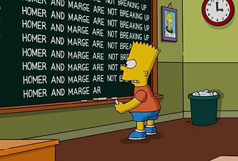 “¡RT y frena los rumores!”, se puede leer en el Twitter oficial de Los Simpson. La imagen que acompaña es la de Bart escribiendo en la tradicional pizarra “Homero y Marge no rompieron”. La aclaración alivió a los miles de seguidores que entraron en pánico cuando comenzó a circular la versión del divorcio.