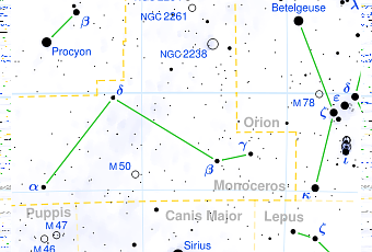 La estrella más brillante de la constelación, Beta Monocerotis, es en realidad un magnífico sistema estelar triple compuesto por tres gigantes azules situado a 690 años-luz de nosotros. Son unas estrellas bastante jóvenes, de tan sólo 34 millones de años de edad.