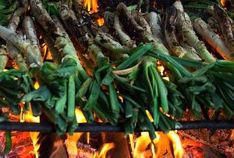 El calçot es una variedad de cebolla tierna que se cultiva en la zona interior de Cataluña y se asa con llama viva de sarmientos hasta que está bien hecho.
