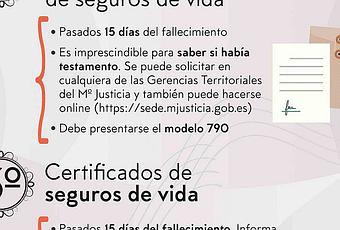 - Certificados de seguros de vida. Transcurridos 15 días del fallecimiento, se informa de todos los seguros de vida que tenía el fallecido. Se puede solicitar en cualquiera de las Gerencias Territoriales del Ministerio de Justicia y también puede hacerse a través de la web https://sede.mjusticia.gob.es. Como ocurre con el Certificado de últimas voluntades, también hay que presentar el modelo 790.
