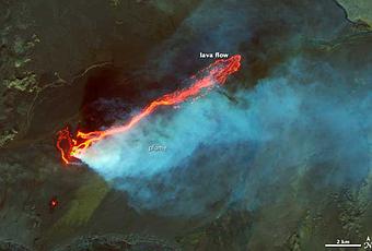 Una isla en el húmedo y atmosféricamente turbulento Atlántico Norte como es Islandia está a menudo envuelta en la capa de nubes y es difícil de observar desde el espacio. Y, últimamente, la isla está haciendo su propia cubierta de nubes, mientras la Tierra se ha dividido y abierto entre los volcanes Bardarbunga y Askja virtiendo lava y gas caliente. La vista del campo de lava Holuhraun ha sido espectacular desde el suelo y desde aviones en vuelo bajo. Imágenes infrarrojas hacen también espectacular vista desde el espacio.