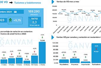 El mercado de ocasión cerrará 2024 con un crecimiento estimado del 9%, hasta superar los dos millones (2.129.497) de unidades vendidas, alcanzando los niveles prepandemia, según las previsiones de las patronales del sector GANVAM (distribuidores oficiales e independientes) y Faconauto (concesionarios). Hasta noviembre, las ventas de turismos de segunda mano acumulan un total de 1.915.132 unidades, lo que supone un 9,2% más, habiéndose vendido 2,1 turismos de ocasión por cada uno nuevo.