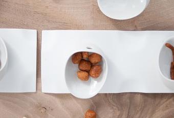Los boles Jomon funcionan muy bien para comer de pie por lo que son perfectos para catering. También se pueden emplear en una comida informal tumbado. Para su uso en mesa, van acompañados de unas bandejas onduladas de diversos tamaños cuyos valles sirven tanto para posar los cuencos como para emplatar.