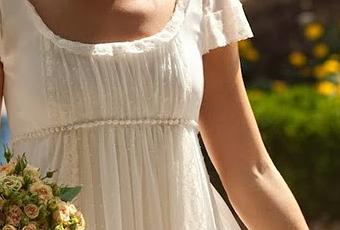 Vestido sencillo y elegante, corte a la cintura y una enorme falda de capa