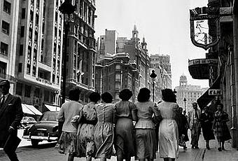 Esta muestra reúne una serie de instantáneas sobre la Gran Vía madrileña de los años cincuenta y sesenta