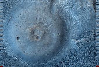 Los investigadores dicen que si la vida existió en Marte, el mejor lugar para buscarla hoy es una región rica en lo que dicen que hubo volcanes de barro expulsando sedimento desde las profundidades.Izquierda: Imagen de posible volcán de barro de 100 metros de diámetro en las planicies boreales de Marte. La textura de la superficie es consistente con la superficie de hielo fracturado. Las imágenes de radar muestran que este tipo de estructuras se enfrían más rápidamente que el terreno vecino. Las colinas también muestran colores consistentes con la formación en presencia de agua. Por otra parte se han detectado plumas de gas metano con un incierto punto de origen, pero que bien podrían ser emanados por volcanes de barro cálido que podrían contener microbios productores de metano. Crédito: HiRISE, MRO, LPL (U. Arizona), NASA.