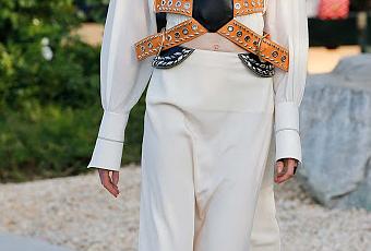 Para la nueva colección de crucero de Louis Vuitton, su Director Creativo Nicolas Ghesquiére ha creado una colección más conveniente considerando que tuvo lugar en Palm Springs, California. Una vez más los diseños tienen inspiración en los años 70 que se puede apreciar en la paleta de colores y estampados empleados. La mujer Vuitton se acerca al futuro con toques metálicos, cinturones y abrigos.