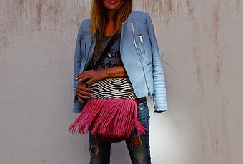 Me puse mis jeans a mordiscos, los más machacados, camiseta print en gris, y la biker azul bebe, que hasta este momento, no le había sacado el tute que se merece.