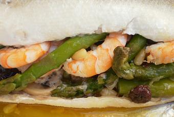 Colocar encima los langostinos intercalándolo con los espárragos.