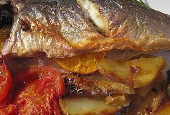 Colocamos las lubinas y los tomates previamente cortados por la mitad, sobre la cama de patatas, cebollas y ajos. Horneamos unos 10¨ más, mas o menos, según horno, hasta que esté hecho el pescado