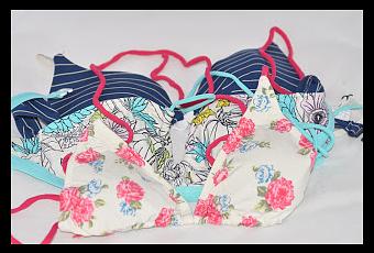 Además de la forma también influye el color,que sea claro y lleve estampado,esto hará efecto de mayor volúmen.En mi bikini rosas con algo de azúl y hojas verdes.