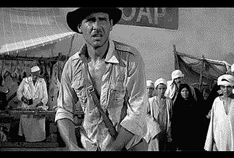 Tras una noche difícil Harrison Ford decidió ser el dueño de esta escena, se comenta que por una indigestión, yo creo que acabó harto de tanto latigo. Enfin, por cualquier cosa, Harrison Ford hizo de otra escena de batallitas con espadachines mal pagados una de las escenas más míticas del cine. Grácias Harry.