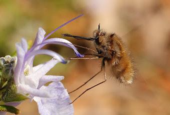 “Al poco las veo salir, 4 en total” – anoté en mi cuaderno de campo. Antes de salir, las abejas solitarias emergían a la luz del sol desde la oscuridad de su agujero excavado en el suelo, asomaban las antenas y, tras uno o dos minutos desperezándose, echaban a volar hacia los romeros de marzo. Permanecí sentado sobre el camino de tierra, esperando verlas volver cargadas de polen, pero pronto me distrajo un zumbido incesante. A un paso de mi, un insecto aparecía como congelado en el aire, cernido a más de un metro del suelo, tan abstraído que apenas se inmutó cuando me acerqué un poco más para observarlo. Era una mosca-abejorro, del género Bombylius; en estos días liban las flores del romero (ver imagen). Pero este Bombylius parecía absorto en alguna tarea importante, que pronto se puso de manifiesto. Porque cada vez que algún insecto cruzaba a menos de unos 3 m de su puesto, el Bombylius, como un centinela, salía tras el intruso, vertiginoso, casi imposible de seguir con la vista, lo perseguía haciendo tirabuzones y quiebros hasta echarlo de lo que él consideraba, sin duda, su territorio, la parcela en la que yo me había sentado. En un rato lo vi expulsar a varios otros Bombylius, y también a abejas solitarias e incluso a moscardones, ¡le daba igual de qué especie fuera el invasor! El mero estímulo de ver a un insecto volando cerca bastaba para disparar su belicoso comportamiento. Apenas pasaba un minuto sin que expulsase a alguien, ¡qué cantidad de energía estaba gastando! Cuando este guardián del camino regresaba de una de sus escaramuzas, se desvió un tanto en su trayecto y entonces fue él quien recibió un ataque… ¡de otro Bombylius! Entonces comprendí que, lo que para mí era tan solo un camino, para estos volátiles era un campo de batalla divisible en territorios que ellos estimaban merecedores de ser defendidos hasta la extenuación. ¿Pero qué era toda esta locura? ¿Qué les estaba pasando a los Bombylius?Una pista es que estas moscas-abejorro se desarrollan como parásitos letales (parasitoides) de abejas y avispas solitarias. Las hembras de Bombylius lanzan huevos a los agujeros-nido de esos insectos, y lo hacen volando casi a ras de tierra, cernidas, disparando los huevos desde el ápice del abdomen con un rápido movimiento hacia abajo de todo el cuerpo en el aire. Previamente las hembras han rebozado los huevos en el polvo del suelo, quizás para facilitar que rueden hacia el agujero. Varias veces he presenciado esta operación, y os aseguro que la madre Bombylius tiene pésima puntería. Pero cuanto más hábil sea volando, lo normal será que acierte más y que tenga por tanto más descendencia. Así, la habilidad en vuelo cernido resulta absolutamente clave para estos insectos. Por eso es lógico que las hembras se apareen preferentemente con machos que hayan demostrado ser los mejores voladores, y, ¿qué mejor prueba de ello que ser el dueño de un territorio? Para conservarlo, el macho seguramente ha debido de expulsar a innumerables intrusos, pelearse en un sinfín de combates aéreos y mantenerse cernido y vigilante hora tras hora. ¡Todo un campeón del aire! Estos ases del vuelo ofrecen para la hembra una buena garantía de futuros descendientes muy hábiles volando, y por tanto bien preparados para acertarle al agujero (si son hembras) o para ganarse un territorio con el que conquistar hembras (si son machos). Todo lo cual ayuda a entender por qué los machos son tan territoriales y pendencieros en el aire. Es curioso pensar que los propios Bombylius ni saben por qué hacen todo esto ni han elegido vivir así. Su conducta, su vida, está sujeta a la selección natural, igual que a la gravedad o a cualquier otra ley de la naturaleza que define los límites de lo que llamamos libertad.En la fotografía, un posible Bombylius analis, el antiguo B. undatus según las claves de Séguy (1926) de Faune de France. Hay varias otras especies de Bombylius en el paraje, y cambian a lo largo del año.