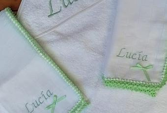 En un tierno verde anís, una toalla y unas gasitas para la pequeña Lucía.
