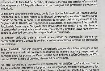 La profesora sostiene que, tras solicitar apoyo institucional por la difusión de carteles ofensivos en su contra dentro de la Facultad de Derecho, su denuncia no habría sido atendida de manera adecuada. Señala que tales omisiones la colocaron en un estado de indefensión, generaron un antecedente grave y afectaron la confianza en los mecanismos internos de protección universitaria.