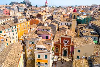 Quedémonos en la capital, Kerkyra, porque aquí hay otra vista de Corfú . En el centro del casco antiguo se encuentra la hermosa iglesia de San Spyridon . Está dedicado a San Agios Spiridon, el santo patrón de Corfú, cuyos huesos también se encuentran en una habitación de la iglesia.