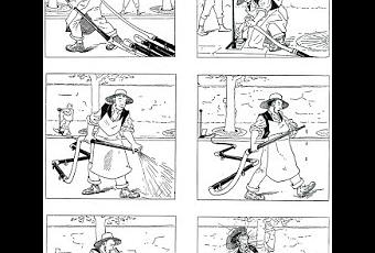 J.R.: Es cierto, pero a mí tampoco me molesta. La ausencia de diferentes planos no me molesta en absoluto. No responde más que a la adaptación del artista a los hechos, a las circunstancias. El Regador regado de Lumiere se filmó en un plano único porque entonces no era práctico volver a cargar la película para cambiar el tipo de plano, porque a nadie se le ocurrió interrumpir la grabación y decir "vamos a grabar otra vez y a continuar la historia desde este mismo punto". Para un cómic, sin embargo, era mucho más sencillo, porque todo lo que se necesitaba para llevarlo a cabo era un lápiz y una hoja de papel.