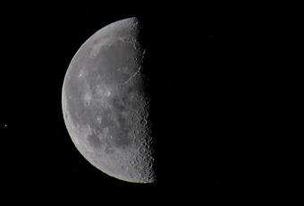 Hoy el cielo se abre y nos deja observar y tranquilamente fotografiar la Luna. Queda poco para que amanezca, son algo más de las siete de la mañana y me llama la atención un punto luminoso junto a ella. Disparé varias tomas y en todas ellas aparece y es visible directamente. No acierto a saber si es alguna estrella de la constelación de Sagitario donde la Luna pasea durante el mes de abril, o algún satélite olvidado, resto de basura o chatarra espacial que órbita a su alrededor.