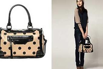 El siguiente modelo es más asequible, el bolso de piel y tela tipo bowling es de Stradivarius en unos tonos perfectos para un denim total look. Como podéis ver es uno de los modelos que más se repiten desde hace temporadas, pero cada vez lo encontramos en colores más atrevidos y, en esta ocasión, adornado con topos.