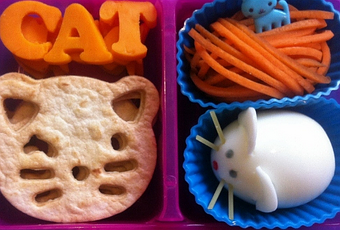 1. Haz un sandwich de jamón york (o pechuga de pavo) con las tortillas de trigo, y después córtalo con un molde de gatito.