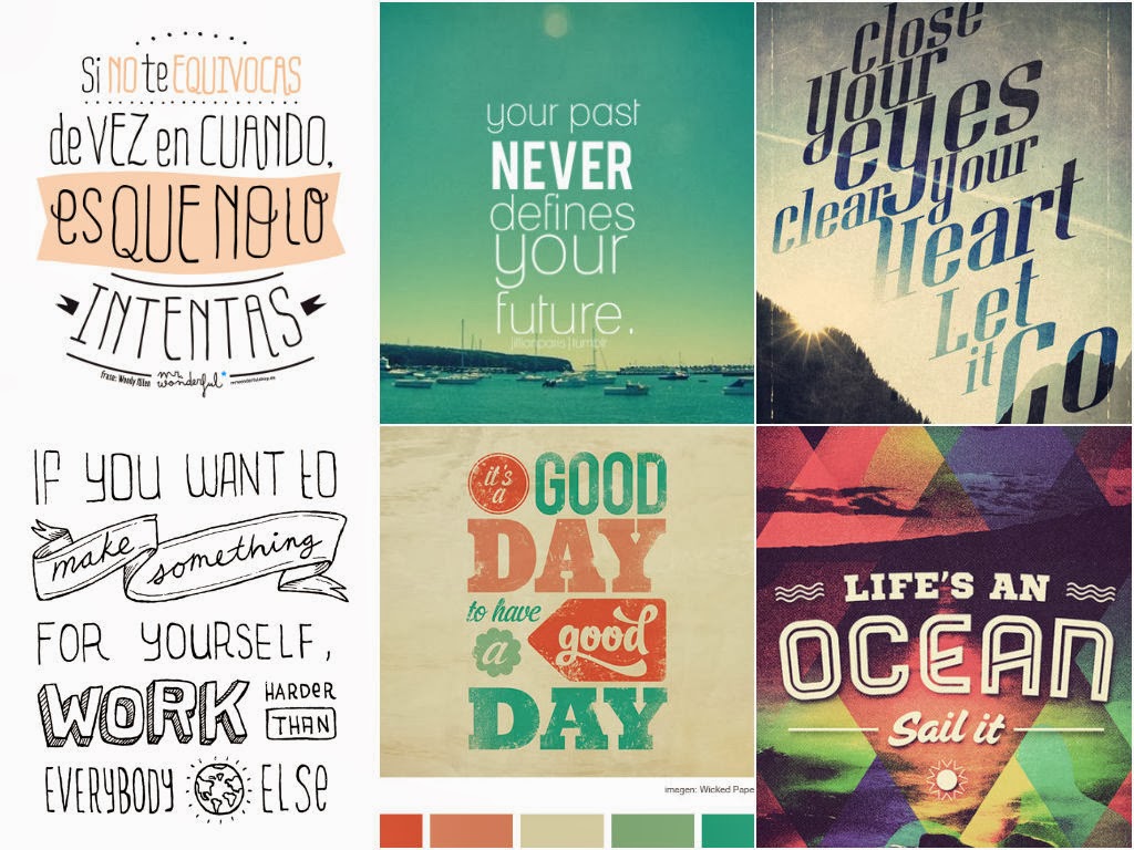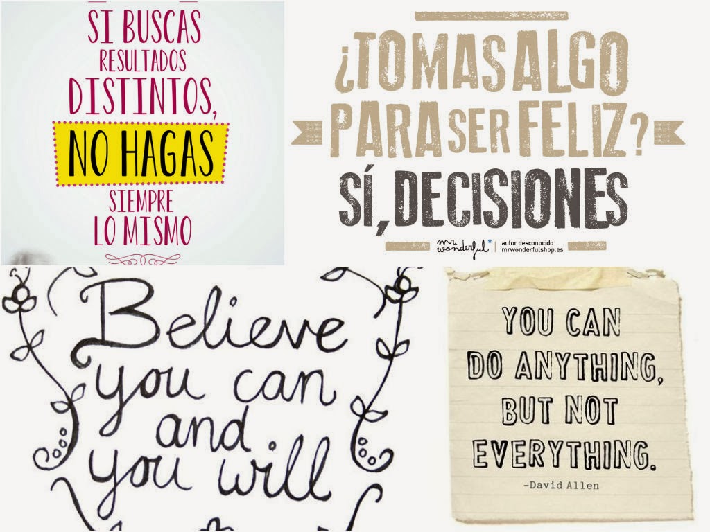 Si buscas resultados distintos, no hagas siempre lo mismo.¿Tomas algo para ser feliz? Sí, decisiones.Cree que puedes, y podrás.Puedes hacer cualquier cosa, pero no todas las cosas.