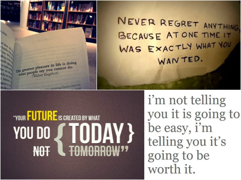 El mayor placer en la vida es hacer lo que te dicen que no puedes.Nunca te arrepientas de nada porque en algún momento, era exactamente lo que querías.Tu futuro es creado por lo que haces HOY. No mañana.No te estoy diciendo que va a ser fácil, te estoy diciendo que valdrá la pena.