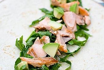 Tortilla Wrap de Salmon y palta : Agreguen espinaca o lechuga , una pisca de sal y limon. El salmón es cocido a la plancha sin nada de aceite y solo necesitas 80grs . Otra opción es atún de lata en agua y bajo en sodio y le pueden agregar tomate en cuadritos, la verán en el siguiente wrap, delicioso!!