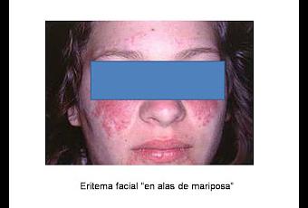 Las manifestaciones mucutáneas son frecuentes en el LES. El eritema malar “en alas de mariposa”, respetando los surcos nasogenianos, que es fotosensible, se presenta en el 60% de los casos. Puede ser plano o elevado, doloroso y pruriginoso, por lo general dura unos pocos días, se cura sin dejar cicatriz, pero a menudo se repite después de la exposición al sol.