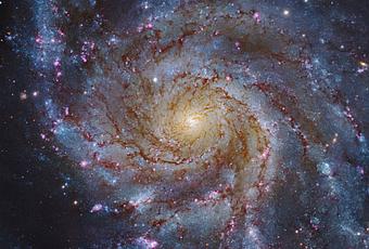 La imagen muestra un ejemplo notable, M101 , que se encuentra a unos 27 millones de años luz , una distancia relativamente cercana que permite estudiarla en detalle. Las observaciones indican que una interacción gravitatoria con una galaxia vecina creó unas ondas muy masivas de gas condensado que continúan en órbita alrededor del centro de la galaxia. Estas ondas comprimen el gas existente y causan la formación estelar. Uno de los resultados es que M101 , también llamada la galaxia del Molinete , contiene varias regiones de formación estelar extremadamente brillantes (llamadas regiones HII ) repartidas en los brazos espirales. M101 es tan grande que su inmensa gravedad distorsiona las galaxias cercanas más pequeñas .