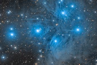 ¿Alguna vez ha visto el cúmulo estelar de las Pléyades? Si lo has hecho, seguramente nunca lo has visto tan lleno de polvo como aquí. Las estrellas de las Pléyades, quizá el cúmulo estelar más famoso del cielo, se pueden ver sin prismáticos, incluso, desde las profundidades de una ciudad contaminada lumínicamente. Con una larga exposición desde un lugar oscuro, sin embargo, la nube de polvo que rodea el cúmulo estelar de las Pléyades se hace muy evidente. Esta fotografía implicó más de 12 horas de exposición y cubre un área del cielo varias veces el tamaño de la Luna llena. También conocido como las Siete Hermanas y M45, las Pléyades se encuentra a unos 400 años luz en la constelación del Toro ( Taurus ). Una leyenda popular con un toque moderno dice que una de las estrellas más brillantes se desvaneció desde que el cúmulo fue nombrado, dejando sólo seis estrellas visibles a simple vista. El número real de estrellas visibles de las Pléyades, sin embargo, puede ser más o menos de siete, dependiendo de la oscuridad del cielo circundante y la claridad de la vista del observador.