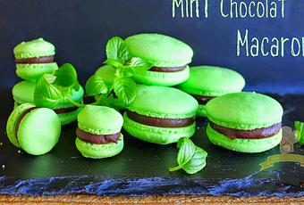 ElaboraciónPreparamos dos bandejas y las forramos con papel de hornear o utilizamos un silpat. Podemos descargarnos unas plantillas para que nos queden del mismo tamaño. Preparamos la manga con la boquilla 1A o una boquilla redonda mediana.En un bol tamizamos la harina de almendras el azúcar y la sal dos veces. Nos costara un poco de trabajo por lo que podemos ayudarnos de una espátula de madera para mover bien la mezcla.Descartamos el resto de mezcla que no pase por el támiz. Limpiamos el bol donde vallamos a montar las claras con unas gotas de vinagre o zumo de limón y un papel de cocina para quitar cualquier resto de grasa.Batimos las claras a velocidad baja unos 30 segundos, subimos a velocidad media y agregamos el azúcar a cucharadas. Subimos la velocidad alta y batimos hasta que se formen picos, cuidado de no pasarnos o quedaran duros. Añadimos las gotas de colorante , y la cucharadita de pasta de menta . Combinamos bien unos 20 segundos.Añadimos la mitad de la mezcla de almendras al merengue y con una espátula y movimientos envolventes vamos mezclándolo todo. Deberíamos conseguir mezclar los ingredientes secos (alrededor de las 15 vueltas)*. Añadimos la mezcla restante y procedemos de la misma manera hasta conseguir que la mezcla tenga la textura de la lava, (unas 25 vueltas más)*. Rellenamos la manga y damos forma a los macarons. Damos unos golpes a la bandeja para quitarles el aire y los ponemos a secar. Para comprobar que ya estén secos la “coquille” debe estar opaca y resistente al tacto. Una vez secos los horneamos a 150º unos 15 minutos. Los dejamos enfriar antes de despegarlos. Si aun están suaves pasarles un cuchillo debajo para despegarlos mejor.Los dejamos reposar en la nevera 24 horas. Si, si es mucho tiempo pero si quieres unos macarons deliciosos no te quedará de otra.Ganache de chocolate negro.175g de chocolate para derretir120g de nata30g de sirope de maízmedia cucharadita de sal30 g de mantequilla suavizada cortada en cubos5 ml de extracto de vainillaPonemos el chocolate troceado en un bol de cristal, metemos un cazo al fuego con la nata y el sirope de maíz.cuando empiece a hervir lo vertemos encima del chocolate dejamos reposar 5 minutos y con una espátula vamos deshaciendo el chocolate cuando ya este integrado le agregamos la mantequilla removemos un poco mas y dejamos enfriar hasta que tenga textura untable. Para rellenar los macarons lo pondremos en una manga desechable con una boquilla redonda.