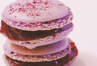 60 gr. harina de almendra 140 gr. azúcar glas80 gr. clara de huevo 1 cucharada de azúcar Colorante violeta Colorante azul Dulce de leche Crema de mantequilla Crema de chocolate Mermelada de fresa