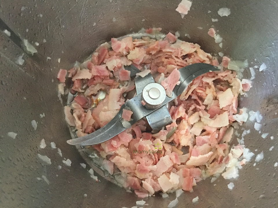 Agrega el bacon en tiras y sofríe todo 8 minutos, varoma, giro a la izquierda y velocidad cuchara.