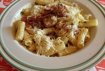 La Carbonara es típica de Roma; sus ingredientes originales son el huevo, el queso (Pecorinoromano o parmesano), el aceite de oliva virgen extra, la pimienta negra y la panceta.