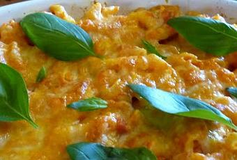 - Escurrir la pasta y verter en una fuente de horno, mezclar con la salsa que habíamos reservado y poner las rodajas de queso Scamorza por encima o espolvorear con el queso rallado.