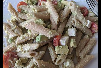 6.A los macarrones escurridos añadimos la salsa, la cebolla picada, el aguacate troceado, el queso feta y los tomates cherry.