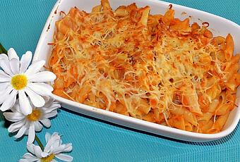 Cuando los macarrones estén cocidos, los escurrimos bien y los añadimos al sofrito. Removemos bien para mezclar y pasamos a una fuente apta para el horno. Espolvoreamos queso rallado y llevamos al horno precalentado a 200º a dorar el queso.