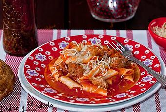 - Volver a poner los macarrones en la cazuela, e incorporar la salsa de tomate, el agua de la cocción (mejora el sabor de la pasta), y el bonito.