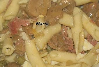 -Cocemos los macarrones y volcamos, bien escurridos sobre los champiñones.-Ligamos bien.