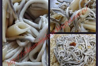 Ingredientes:200 grs de macarrones2 paquetes de gulas2 guindillas2 dientes de ajo fileteado2 cucharadas de aceite de olivasal del himalaya al gusto