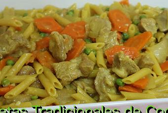 Cuando probé esta receta supe que no podría faltar en mi recetario, se trata de un estofado o guiso, como quieras llamarlo, pero que no lleva caldo, ya que el caldo es para cocer los macarrones, y así queda como un plato de pasta con el magro y las verduras guisadas, una forma muy completa y sabrosa de cocinar la pasta.