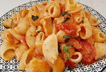 El hummus, aparte de ser una crema de untar o un dip, tiene múltiples usos en la cocina. También puede utilizarse en pizzas, para aliñar las ensaladas y platos de verdura o, ¿por qué no? como una salsa para la pasta. Esta receta de pasta es muy sencilla y puede sacarte de un apuro si no tiene mucho tiempo para cocinar. Para prepararla hemos elaborado una salsa de hummus con tomate y tomates cherry que ha quedado para chuparse los dedos.