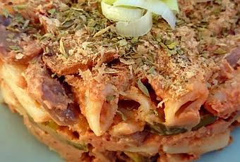 6. Vertemos la salsa encima de los macarrones y los horneamos durante media hora a 180ºC.