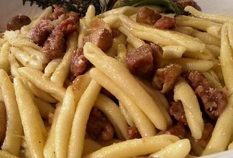350 gr. de Pasta Maccheroncini o Macarrones, 2 salchichas, 100 gr. de setas boletus o champiñones, 1 diente de ajo, brandy, tomillo, parmesano rallado, sal y aceite.