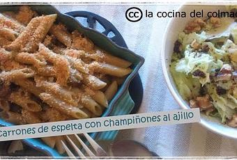 En una sartén, ponemos un chorrito de aceite y añadimos los ajos picados, los champiñones en trocitos o en láminas, el perejil picadito, una pizca de sal y de pimienta. Cocinamos unos 10 minutos.En la misma olla que habíamos usado para cocer los macarrones, ponemos la nata con un poquito de cúrcuma y pimienta negra y damos un hervor. Añadimos los macarrones y los champiñones y cocinamos 2-3 minutos. Los ponemos en una fuente de horno, espolvoreamos con un poquito de levadura de cerveza y gratinamos en el horno unos minutos, para que se tueste un poquito la levadura.Preparamos la ensalada mezclando todos los ingredientes y servimos.