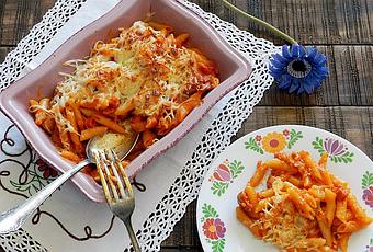 Cuando los macarrones estén cocidos, los escurrimos bien y los añadimos al sofrito. Removemos bien para mezclar y pasamos a una fuente apta para el horno. Entre los macarrones añadimos 5-6 nueces de mantequilla. Espolvoreamos queso rallado y llevamos al horno precalentado a 200º a dorar el queso.