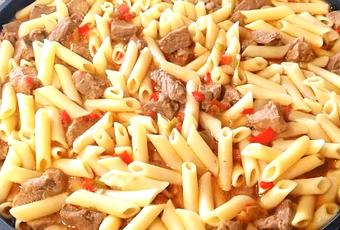 En casa nos encantan los guisos, tanto los que llevan patata como los que hacemos con pasta. Hago muy a menudo la ternera gallega guisada con patatas y Albariño y el estofado de ternera con caracolas. Este último es similar al de hoy, la diferencia está en que la pasta va cocida aparte y la mezclo con la carne al final.