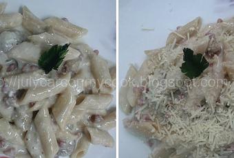 Poner el aceite en la cubeta de la GM E menú plancha, pochar un poco la cebolla una vez pochada añadir los champiñones, el jamón y rehogar un poco, cancelar programa, añadir los macarrones cubrir al ras de agua, sal, pimienta y nuez moscada, tapar con válvula cerrada, menú turbo 6 minutos, cuando termine despresurizar manualmente, añadir el queso de untar, remover hasta que se deshaga el queso y servir tal cual ó con un poco de queso rayado light, como mas os guste